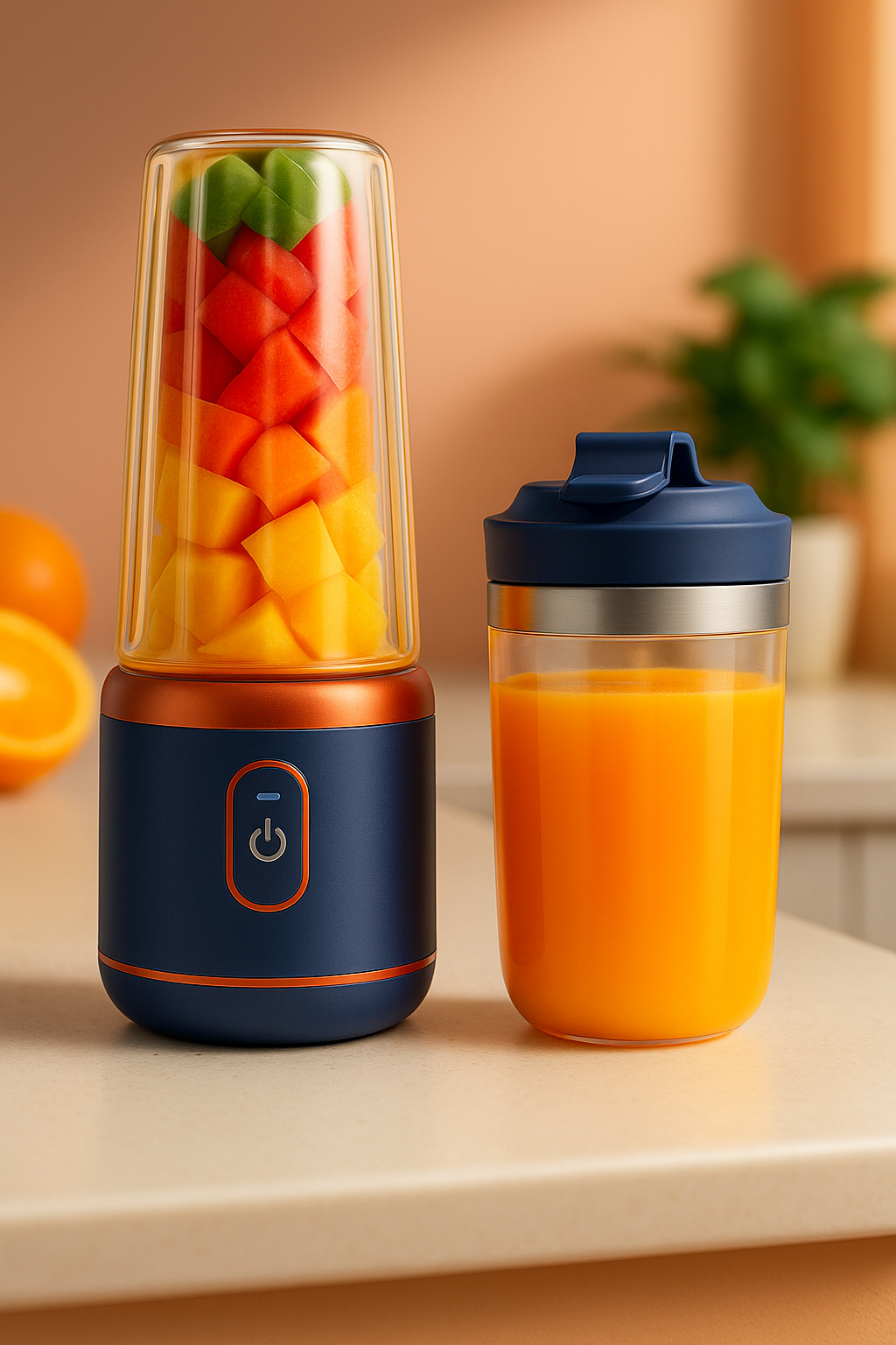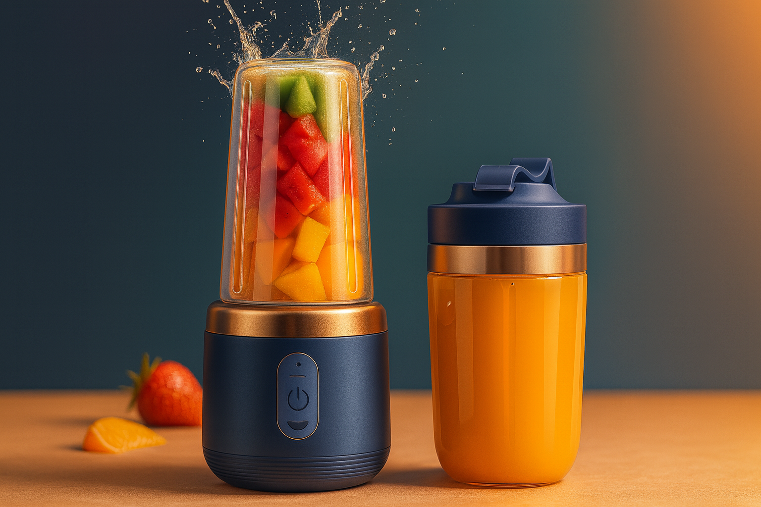A portable mini blender and matching juice cup shown with fresh fruits including strawberries and oranges. The blender container is filled with colorful chopped fruit, while the juice cup contains freshly blended orange juice. The background features a cool splash effect, highlighting freshness, convenience, and on-the-go juicing.
